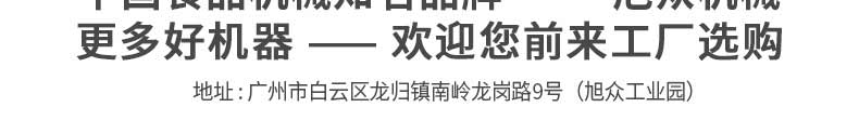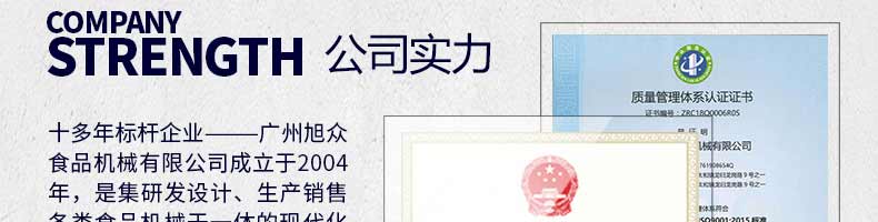 廣州旭眾食品機(jī)械有限公司是一家集科研開發(fā),生產(chǎn)設(shè)計(jì),營銷服務(wù)為一體的現(xiàn)代化生產(chǎn)企業(yè)?,F(xiàn)代化生產(chǎn)車間,精湛制造技術(shù),所產(chǎn)機(jī)械歷經(jīng)市場重重考驗(yàn),不斷贏得海內(nèi)外客戶的贊譽(yù)。