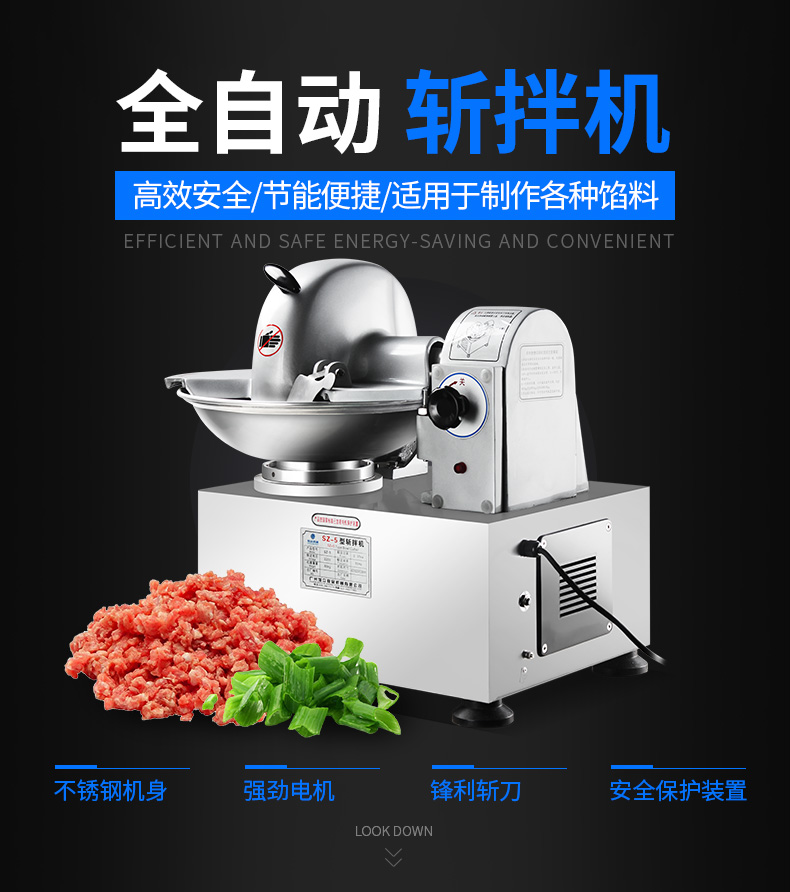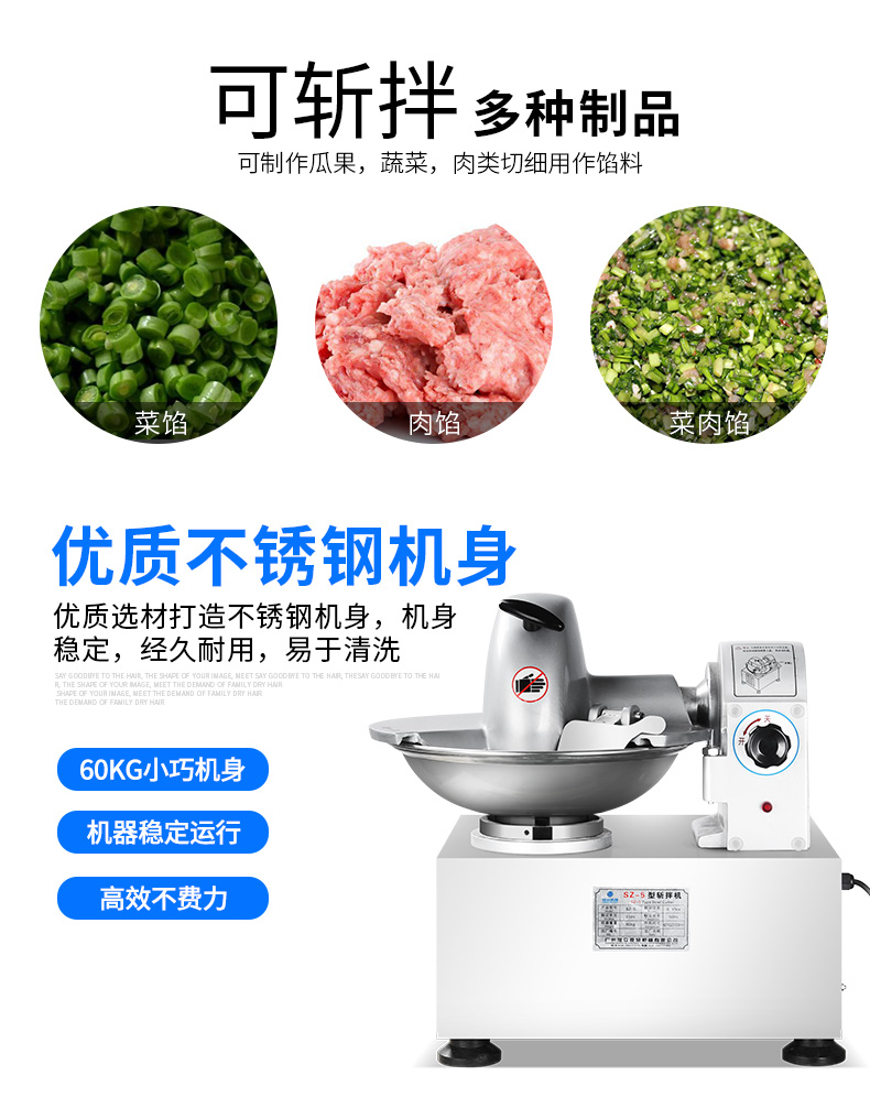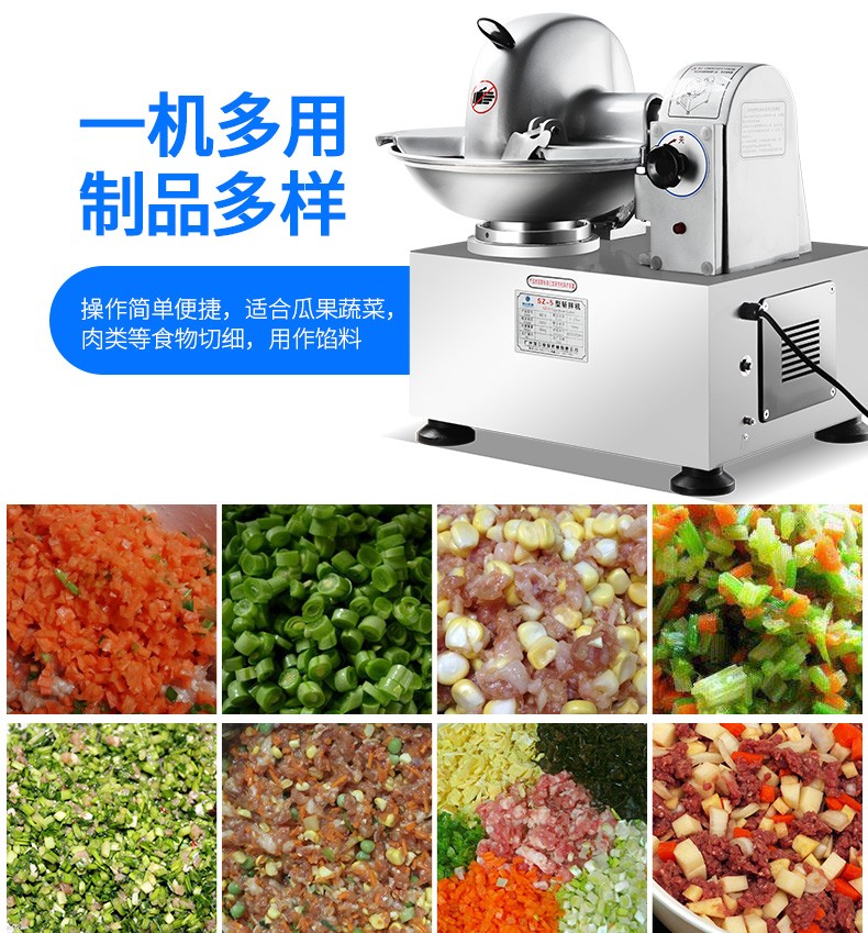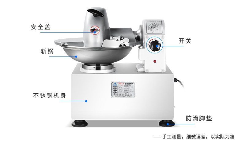 SZ-5型斬拌機(jī),全自動(dòng)斬拌機(jī),高效安全、節(jié)能便捷、適用于制作各種餡料??蓴匕瓒喾N制品,可制作瓜果,蔬菜,肉類(lèi)切細(xì)用作餡料。優(yōu)質(zhì)選材打造不銹鋼機(jī)身,機(jī)身穩(wěn)定,經(jīng)久耐用,易于清洗。
