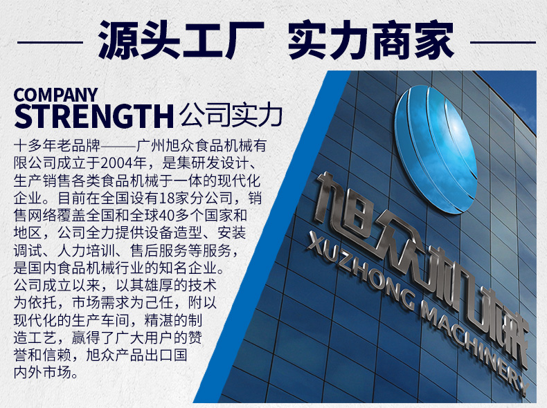 廣州旭眾食品機(jī)械有限公司是一家集科研開(kāi)發(fā),生產(chǎn)設(shè)計(jì),營(yíng)銷(xiāo)服務(wù)為一體的現(xiàn)代化生產(chǎn)企業(yè)。現(xiàn)代化生產(chǎn)車(chē)間,精湛制造技術(shù),所產(chǎn)機(jī)械歷經(jīng)市場(chǎng)重重考驗(yàn),不斷贏得海內(nèi)外客戶(hù)的贊譽(yù)。