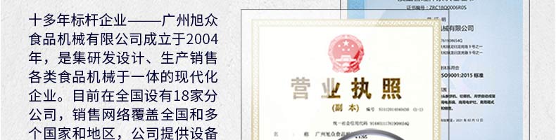廣州旭眾食品機械有限公司是一家集科研開發(fā),生產(chǎn)設(shè)計,營銷服務為一體的現(xiàn)代化生產(chǎn)企業(yè)?,F(xiàn)代化生產(chǎn)車間,精湛制造技術(shù),所產(chǎn)機械歷經(jīng)市場重重考驗,不斷贏得海內(nèi)外客戶的贊譽。