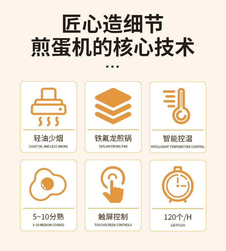 商用全自動智能煎蛋機,匠心造細節(jié)煎蛋機的核心技術,輕油少煙、5~10分熟、鐵氟龍煎鍋、觸屏控制、智能控溫??谖秱€性化五分/七分/十分熟,智能控溫上下鍋恒溫煎烤。