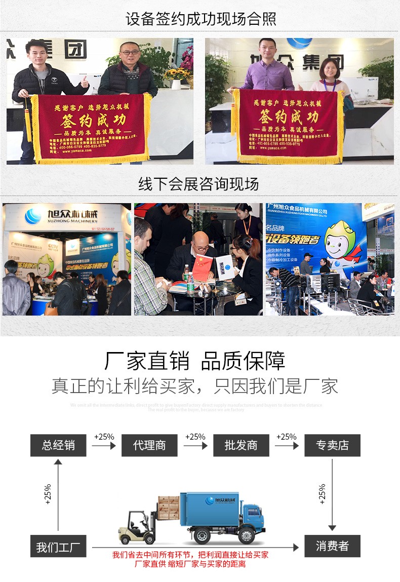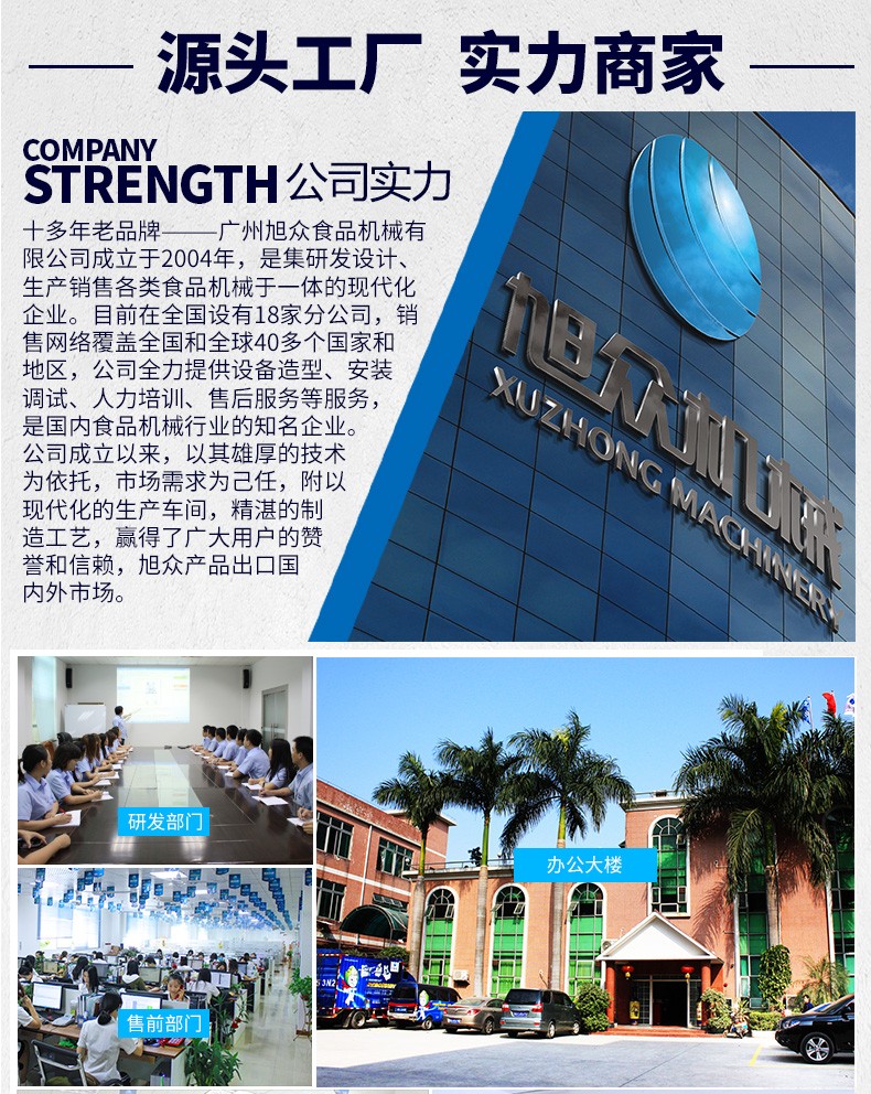 廣州旭眾食品機械有限公司是一家集科研開發(fā),生產(chǎn)設(shè)計,營銷服務為一體的現(xiàn)代化生產(chǎn)企業(yè)。現(xiàn)代化生產(chǎn)車間,精湛制造技術(shù),所產(chǎn)機械歷經(jīng)市場重重考驗,不斷贏得海內(nèi)外客戶的贊譽。