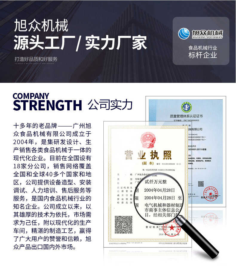 廣州旭眾食品機(jī)械有限公司是一家集科研開發(fā),生產(chǎn)設(shè)計(jì),營(yíng)銷服務(wù)為一體的現(xiàn)代化生產(chǎn)企業(yè)。現(xiàn)代化生產(chǎn)車間,精湛制造技術(shù),所產(chǎn)機(jī)械歷經(jīng)市場(chǎng)重重考驗(yàn),不斷贏得海內(nèi)外客戶的贊譽(yù)。