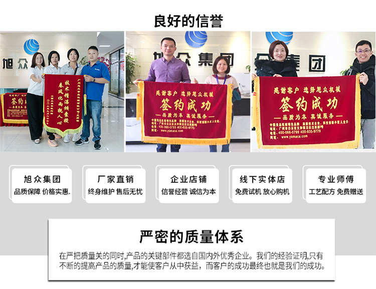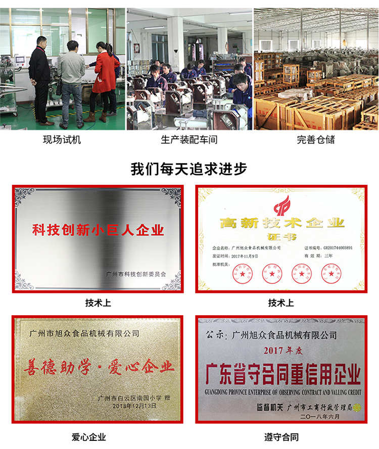 廣州旭眾食品機(jī)械有限公司是一家集科研開發(fā),生產(chǎn)設(shè)計,營銷服務(wù)為一體的現(xiàn)代化生產(chǎn)企業(yè)。現(xiàn)代化生產(chǎn)車間,精湛制造技術(shù),所產(chǎn)機(jī)械歷經(jīng)市場重重考驗,不斷贏得海內(nèi)外客戶的贊譽。