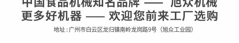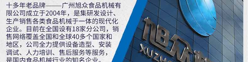 廣州旭眾食品機械有限公司是一家集科研開發(fā),生產(chǎn)設計,營銷服務為一體的現(xiàn)代化生產(chǎn)企業(yè)。現(xiàn)代化生產(chǎn)車間,精湛制造技術,所產(chǎn)機械歷經(jīng)市場重重考驗,不斷贏得海內(nèi)外客戶的贊譽。