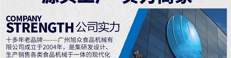 廣州旭眾食品機(jī)械有限公司是一家集科研開發(fā),生產(chǎn)設(shè)計(jì),營(yíng)銷服務(wù)為一體的現(xiàn)代化生產(chǎn)企業(yè)?,F(xiàn)代化生產(chǎn)車間,精湛制造技術(shù),所產(chǎn)機(jī)械歷經(jīng)市場(chǎng)重重考驗(yàn),不斷贏得海內(nèi)外客戶的贊譽(yù)。