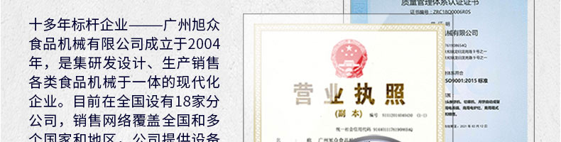 廣州旭眾食品機(jī)械有限公司是一家集科研開(kāi)發(fā),生產(chǎn)設(shè)計(jì),營(yíng)銷(xiāo)服務(wù)為一體的現(xiàn)代化生產(chǎn)企業(yè)。現(xiàn)代化生產(chǎn)車(chē)間,精湛制造技術(shù),所產(chǎn)機(jī)械歷經(jīng)市場(chǎng)重重考驗(yàn),不斷贏得海內(nèi)外客戶的贊譽(yù)。
