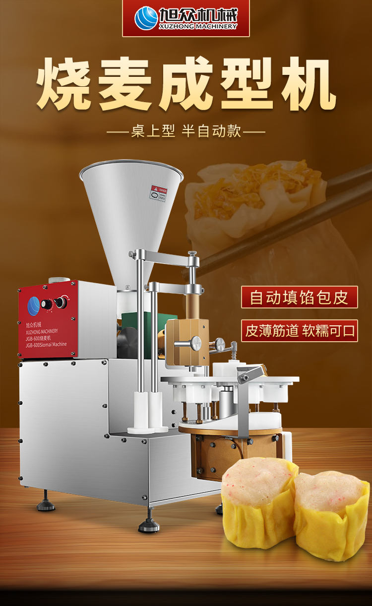 JGB-600燒麥機(jī),自動填餡包皮功能:臺式半自動單聯(lián)式燒麥成型機(jī),可以使用手工燒麥皮配合機(jī)器生產(chǎn)燒賣,其面皮口感好,產(chǎn)品外形美觀。餡料多與少可調(diào)節(jié)高效率1800個小時