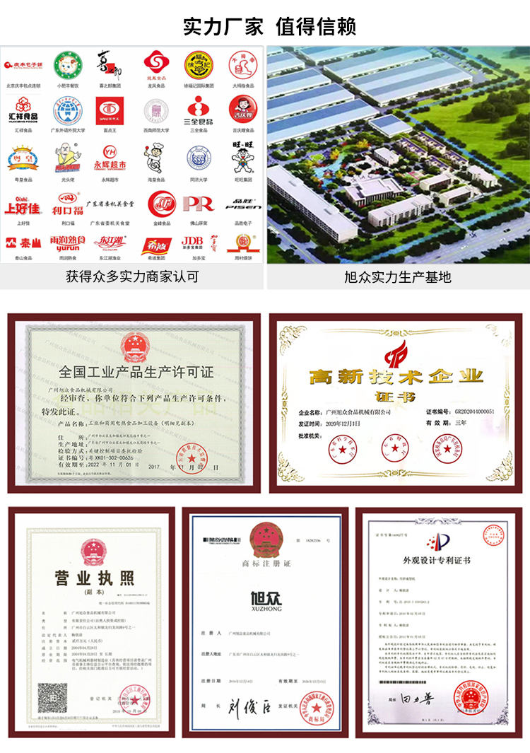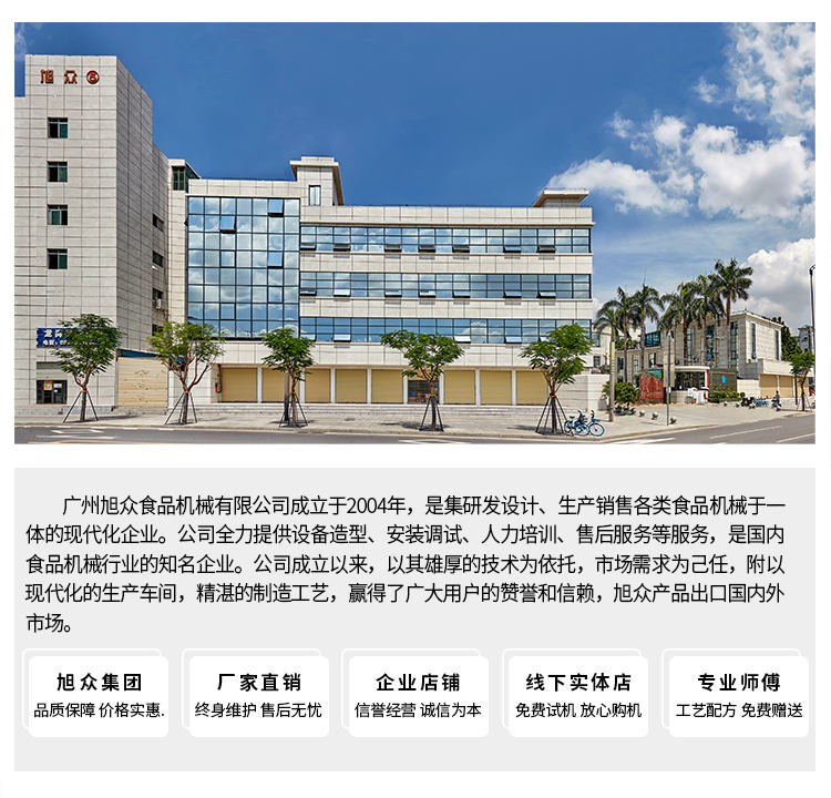 廣州旭眾食品機(jī)械有限公司是一家集科研開發(fā),生產(chǎn)設(shè)計,營銷服務(wù)為一體的現(xiàn)代化生產(chǎn)企業(yè)。現(xiàn)代化生產(chǎn)車間,精湛制造技術(shù),所產(chǎn)機(jī)械歷經(jīng)市場重重考驗(yàn),不斷贏得海內(nèi)外客戶的贊譽(yù)。
