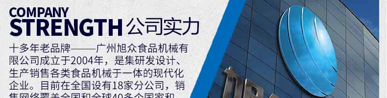 廣州旭眾食品機(jī)械有限公司是一家集科研開(kāi)發(fā),生產(chǎn)設(shè)計(jì),營(yíng)銷(xiāo)服務(wù)為一體的現(xiàn)代化生產(chǎn)企業(yè)。現(xiàn)代化生產(chǎn)車(chē)間,精湛制造技術(shù),所產(chǎn)機(jī)械歷經(jīng)市場(chǎng)重重考驗(yàn),不斷贏得海內(nèi)外客戶的贊譽(yù)。