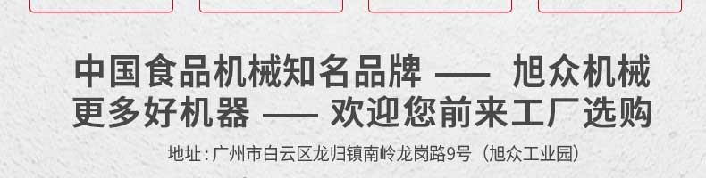 廣州旭眾食品機械有限公司是一家集科研開發(fā),生產(chǎn)設(shè)計,營銷服務(wù)為一體的現(xiàn)代化生產(chǎn)企業(yè)?,F(xiàn)代化生產(chǎn)車間,精湛制造技術(shù),所產(chǎn)機械歷經(jīng)市場重重考驗,不斷贏得海內(nèi)外客戶的贊譽。