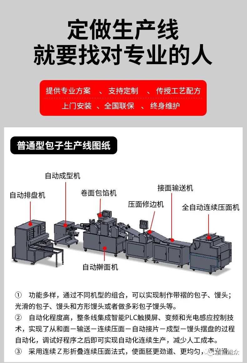 智能包子饅頭生產(chǎn)線,功能多樣,通過不同機型的組合,可以實現(xiàn)制作帶褶的包子、饅頭;光滑的包子、饅頭和方形饅頭或者做多彩包子饅頭等。