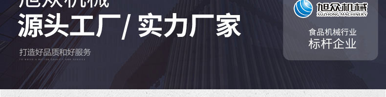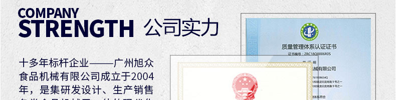 廣州旭眾食品機械有限公司是一家集科研開發(fā),生產(chǎn)設計,營銷服務為一體的現(xiàn)代化生產(chǎn)企業(yè)。現(xiàn)代化生產(chǎn)車間,精湛制造技術,所產(chǎn)機械歷經(jīng)市場重重考驗,不斷贏得海內(nèi)外客戶的贊譽。