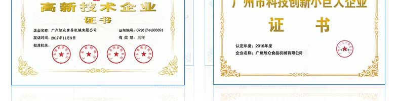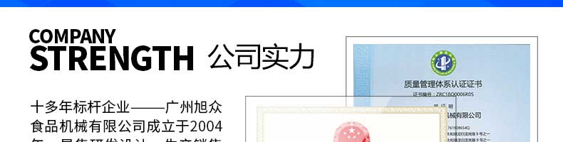 廣州旭眾食品機械有限公司是一家集科研開發(fā),生產(chǎn)設計,營銷服務為一體的現(xiàn)代化生產(chǎn)企業(yè)?,F(xiàn)代化生產(chǎn)車間,精湛制造技術,所產(chǎn)機械歷經(jīng)市場重重考驗,不斷贏得海內外客戶的贊譽。